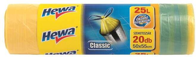 Zárószalaggal ellátott szemeteszsák, a könnyebb kezelhetőség és higiénikusság érdekében. Méret: 50*55 cm Űrtartalom: 25 l Vastagság: 12 mikron Kiszerelés: 20 db/ tekercs Márka:Hewa Típus név:Szemeteszsákok Súly (kg):0,15 title:Elengedhetetlen, minden háztartásban. description:Alapvető dolgok, amik nem hiányozhatnak egy otthonból sem. papiron keywords:szemeteszsák, szemé