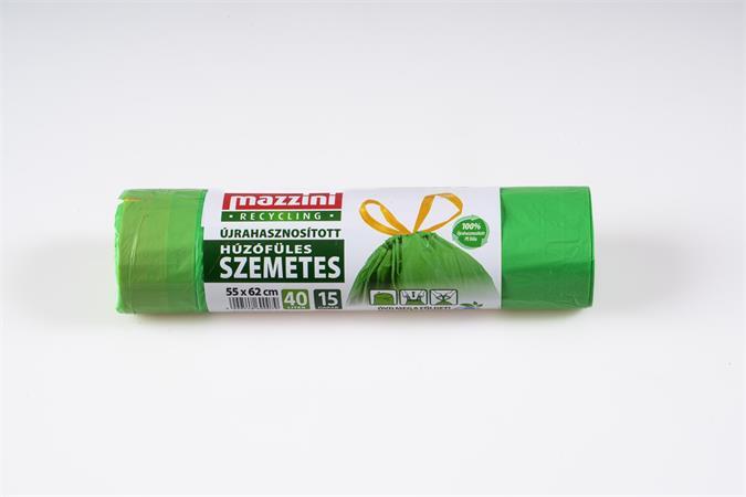 Ezek a termékek csak szelektív hulladékgyűjtésből származó PE fóliából készülnek, hatékonyan felhasználva a meglévő műanyag hulladékot, így 100%-ban újrahasznosított PE szemeteszsákok. Könnyen kezelhető és higiénikus, mivel a megtelt szemeteszsák szája az összehúzható „füleknél fogva megemeléskor összezáródik. - 100%-ban újrahasznosított PE fólia - húzó