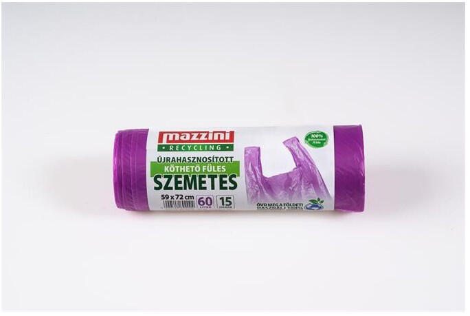 Szemeteszsák, újrahasznosított, köthető füles, 60 l, 15 db, 59x72 cm, MAZZINI Ezek a termékeink csak a szelektív hulladékgyűjtésből származó PE fóliából készülnek, hatékonyan felhasználva a meglévő műanyag hulladékot, így 100%-ban újrahasznosítottak. Praktikus fülének használatával a szemetes biztonságosan és higiénikusan zárható, vihető. - 100%-ban újrahaszn