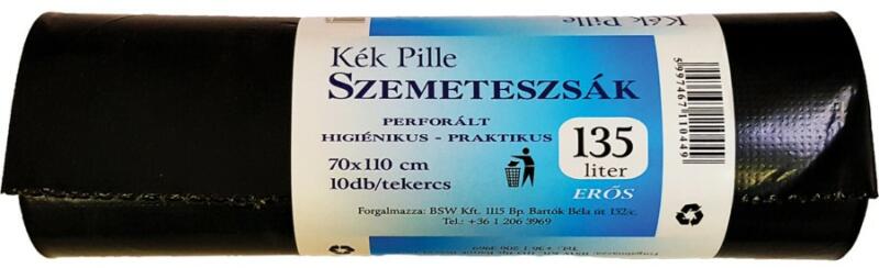 Erős szemeteszsák, perforált, 135 L-es. Méret: 70x110 cm Vastagság: 30 mikron Szín: fekete Kiszerelés: 10 db/tekercs