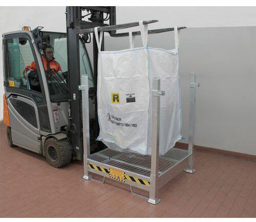 A galvanizált acélból készült nagy zsákokat tartó állványokat a nagy zsákok biztonságos tárolására és szállítására tervezték és tesztelték. A szétszerelhető szerkezet jelentősen csökkenti a szállítási helyet, míg az egymásra helyezhető kialakítás optimalizálja a tárolási helyet. Szerelhető, tűzihorganyzott acélszerkezet levehető tartóoszlopokkal. Rácsos a