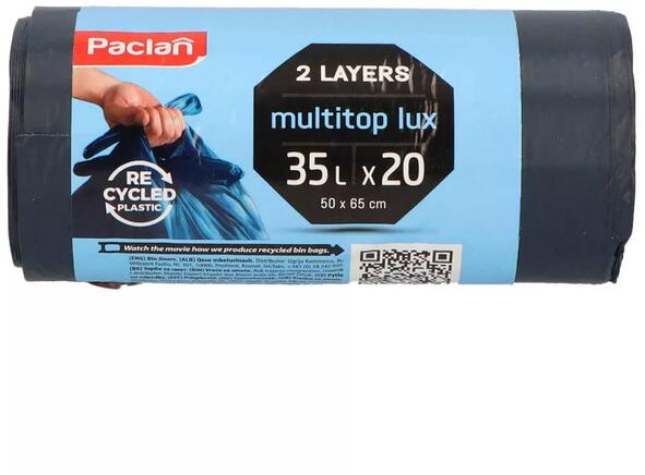 Extra erős kétrétegű szemeteszsák. Minőségi Paclan szemeteszsák, könnyedén összeköthető felső résszel. Nem számít milyen jellegű hulladék kerül a zsákba, a négy darab szár segítségével akár oldalanként is összeköthető a zsák, megkönnyítve annak hordozását. 35 literes 50*65cm 20db/cs