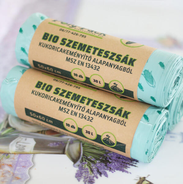 A környezettudatos otthonok kiegészítői az ún. PLA komposztálható szemetes zsákok, melyek műanyagpolimerek helyett kukoricakeményítőből készülnek, és a megfelelő körülmények között 90 nap alatt teljes mértékben lebomlanak. A csomag 10 darab közepes méretű, azaz 30 literes szemetes zsákokat tartalmaz. Elsősorban konyhai vagy irodai kukákhoz ajánljuk.