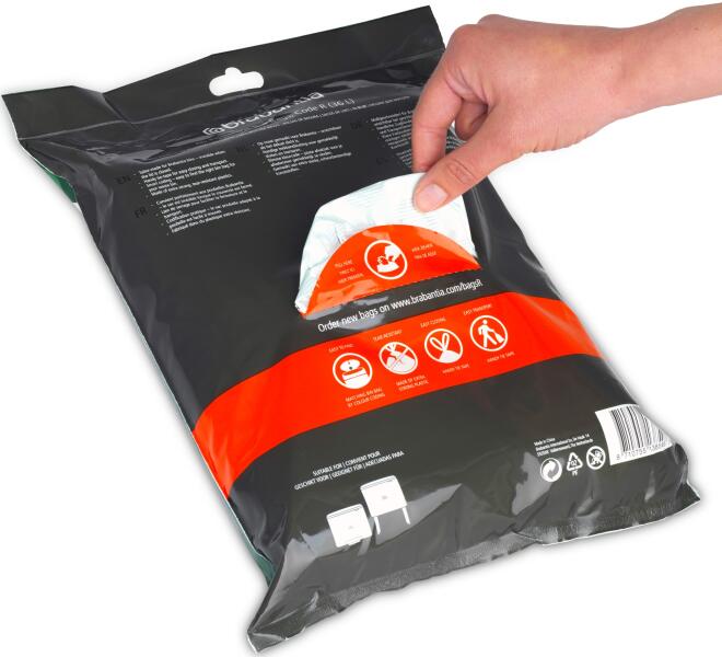Az "R" méretű Brabantia PerfectFit 36L-es szemeteszsák kiváló minőségű, szakadásálló, 15-25 mikron vastagságú PE műanyagból készült. A zsák szája egy praktikus kötőszalaggal zárható, és könnyedén, perforáció mentén téphető le a tekercsről. A Brabantia kukákat úgy tervezték, hogy a perem vagy fedél teljesen elrejtse a szemeteszsákot, így az összkép sokkal esz