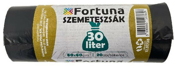 Szemeteszsák FORTUNA 30L fekete 50x60 cm 20 darabos Fekete színű szemeteszsák háztartási és irodai célra. Termékadatok: Záródása: sima Űrtartalom: 30 literes Vastagság: 12 mikronos Kiszerelés: 20 db/ tekercs Méret: 50x60 cm