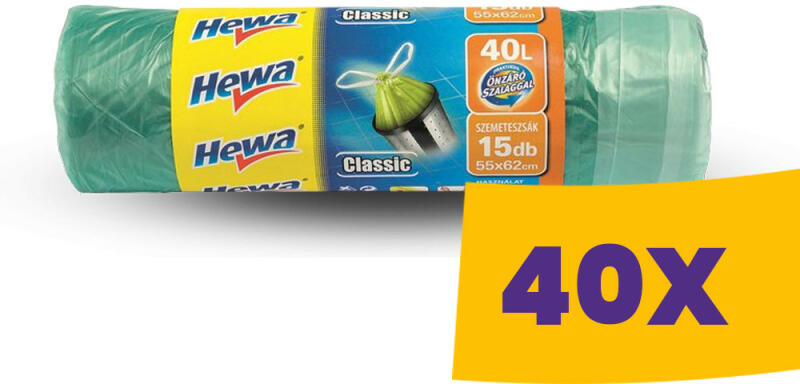 Zárószalaggal ellátott 40L-es szemeteszsák, a könnyebb kezelhetőség és higiénikusság érdekében. A praktikus, ellenálló és erős HEWA Szemeteszsákok kiválóan alkalmazhatók a legnagyobb igénybevételt jelentő helyzetekben is. Méret: 55*62 cm Űrtartalom: 40 l Vastagság: 15 mikron Kiszerelés: 15 db/ tekercs