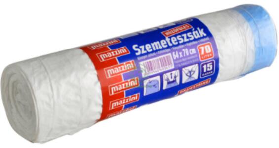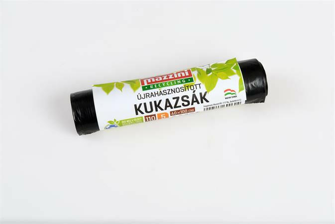 Szemeteszsák, újrahasznosított, 110 l, 5 db, 60x100 cm, MAZZINI Újrahasznosított kukazsák termékeink csak szelektív hulladékgyűjtésből származó PE fóliából készül, hatékonyan felhasználva a környezetünkben meglévő, összegyűjtött műanyag hulladékot. - 100%-ban újrahasznosított PE fólia - 110 liter - 5 db/tekercs - 60x100 cm/db - fekete - 17