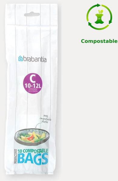 Brabantia komposztálható PerfectFit szemeteszsák (Code C) 10-12 liter, 10 darab - tökéletesen illeszkedik a Brabantia szemetesekbe - könnyen behelyezhető - gyorsan eltávolítható Fontos tudnivalók a komposztálható Brabantia Perfectfit zsákokhoz: a csomagolás nem komposztálható anyagból készült, így a normál műanyag hulladékok közé kérjük elhelyezni kukorica keményítőb