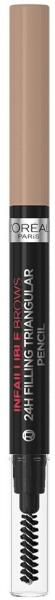 Fedezze fel az egyedi technológiát a L'Oréal Paris Infaillible Brows 24H Filling Triangular Pencil háromszög alakú szemöldökcezuzával az egységes és természetes hatású szemöldökért. Szilárd textúra, mely felvitelkor krémes állagú az extra kényelmért é
