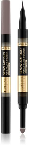 Eveline Cosmetics Brow Art Duo, 8 g, szemöldökceruza nőknek, A kiváló minőségű Eveline Cosmetics Brow Art Duo szemöldökceruza segítségével tökéletesen formázott és telt szemöldököt hozhat létre. Tulajdonságok: púderes állag géles állag vízálló termék természetes hatás hoz létre biztosítja a kész szemöldök egy pillanat alatti formázását volument és formát a