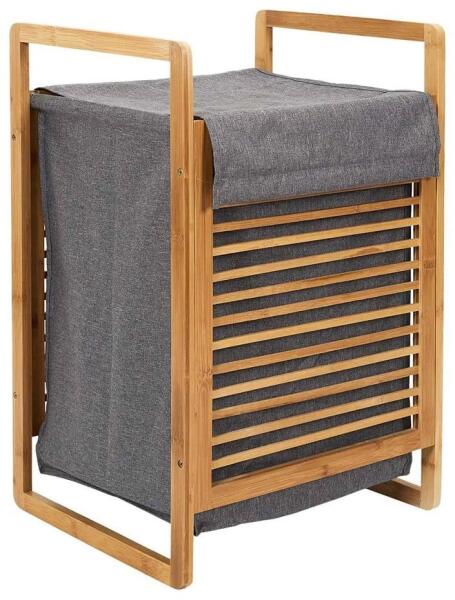 Skandináv stílusú design darab fürdőszobákba. A szürke HOLDE szennyeskosár minden stílusos fürdőszoba szerves részévé válik. A természetes bambusz szürke szövettel kombinálva könnyen összeilleszthető más bútorokkal. Az elegáns lakkozott bambusz konstrukció nedvességgel és hővel szembeni ellenálló képességével tűnik ki. A szövettáska könnyen kivehető és kiür