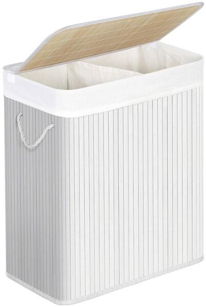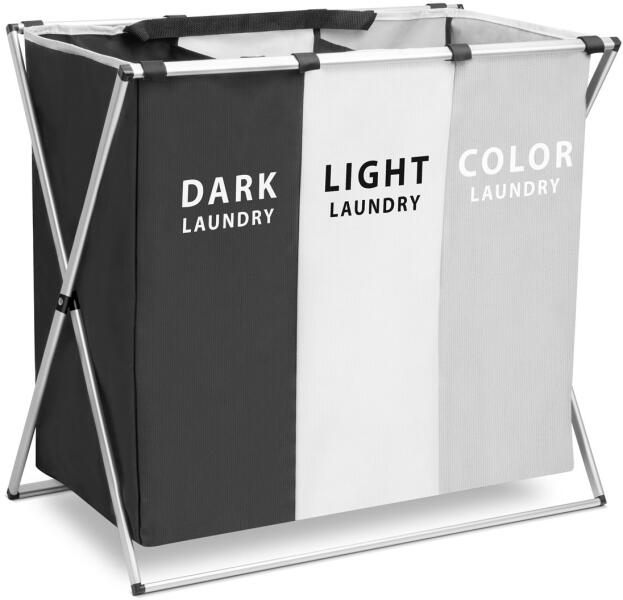 Modern megjelenésű, szövetből készült szennyestartó kosár több rekesszel. A masszív, fém váznak és a nagy befogadóképességnek köszönhetően akár több kilógram ruha, ágynemű tárolására is alkalmas. A rekeszek lehetővé teszik a különböző színű ruhák elkülönítését. Az egy mozdulattal történő összecsukás és a hordozófülek könnyű hordozhatóságot garan