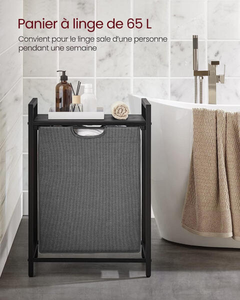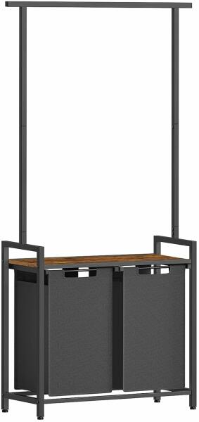 szennyeskosár, 2 részes szennyestartó ruhatartóval, kihúzható és kivehető béléssel, polc, 2 x 46 liter, 73 x 33 x 177 cm, rusztikus barna és fekete: [2 rekesz a különálló ruha tárolására] A szennyeskosár teljes kapacitása: 92 liter (46 liter polconként). 2 rekesz segíti a ruhaneműk szín vagy típus szerinti elkülönített tárolását [Polccal] A szennyeskosár-polc extra