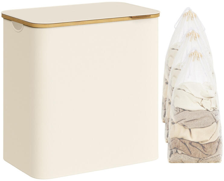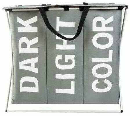 A tágas és modern kosár rengeteg tárolóhelyet kínál a piszkos ruhaneműk számára. A masszív szövetzsák 3 nagy rekesszel (a sötét, világos és színes ruhák elválasztására) gyorsan kivehető a ruhakosárból, és a tartalommal együtt szállítható. A kosarat nagyon könnyű tisztán tartani, nedves ruhával törölheti. A kosár masszív váza biztosítja a stabilitást. Az old