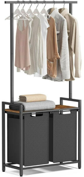 Több mint szennyestartó. Egy tökéletes bútordarab mosókonyhába, fürdőszobába vagyegyéb helyiségekbe, ami tartalmaz 2 darab fémvázra szerelt vászonszövet szennyestartót, valamint egy felső ruhafüggesztőt. A ruhatartó kosarak kihúzhatóak, a bútor emellett tároló vagy konzolasztalként is használható. A robusztus acélváz és a kiváló minőségű MDF bútorlap kombinác