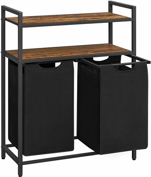 szennyeskosár, szennyestartó, szennyesválogató 2 kihúzható és kivehető zacskóval, 2 tárolópolccal, zacskónként 46 literes kapacitás, fürdőszobába, mosókonyhába, rusztikus barna és fekete: 2 táska, 2 polc – rengeteg tárhely!Válogassa szét a ruhaneműt színek szerint a két szövettáskával (46 liter/zacskó), és tegye a mosószereket és az öblítőket a két polcra. A