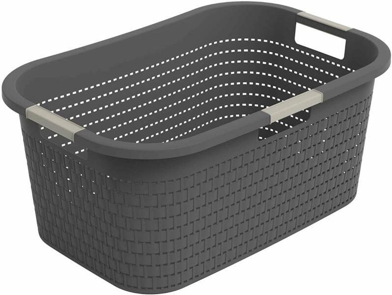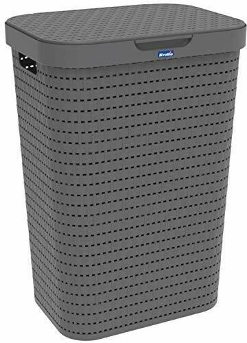 Műanyag szennyeskosár rattan szövés stílusban. Modern dizájn, minőségi kidolgozás és 55 literes térfogat. A kosár tartós és erős műanyagból készült. Minőségi kivitelezés a svájci Rotho márkától. Termék részletek: méretek: 42 x 32,2 x 57,7 cm (h x sz x ma) anyaga: műanyag szín: antracit súlya: 1,17 kg Csomag tartalma: 1 x szennyeskosár