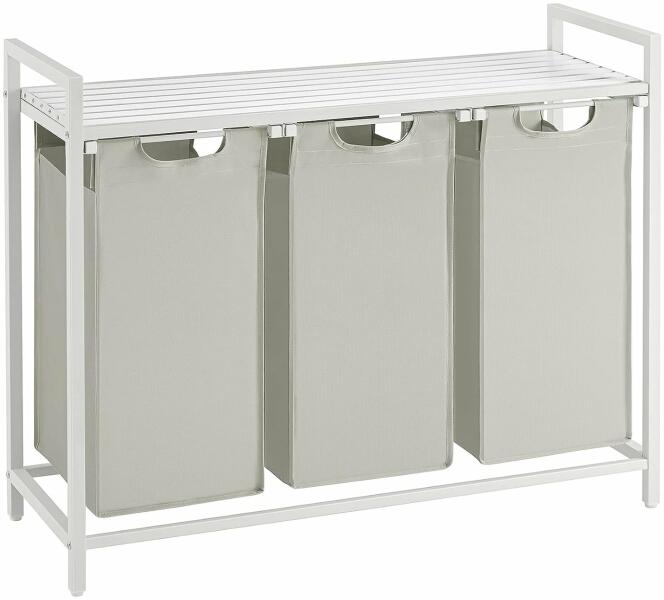 szennyeskosár, 3 tárolórekesz, 3 kivehető Oxford vászontáska, polc, fém keret, 3 x 38 l, 92,5 x 33 x 72 cm, fehér : [3 válogatórekesz] Ennek a szennyeskosárnak a teljes térfogata 114 liter (38 liter egyenként). A 3 rekeszes kialakítás segít a ruhák típus szerinti rendezésében, vagy a világos és a sötét elkülönítésében [Gyakorlati tálca] A szennyeskosár tálcája töb