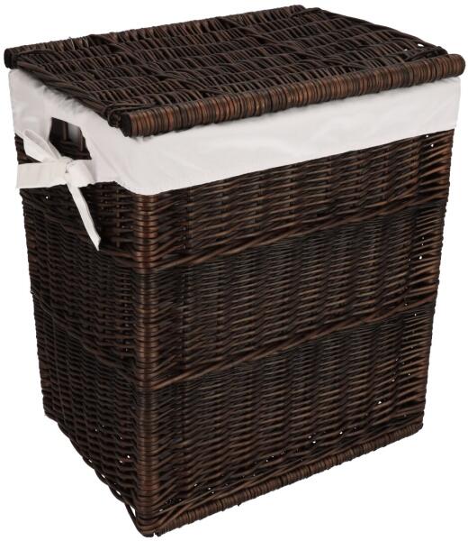 Kézzel fonott, minőségi fűzfavesszőből készült szennyeskosár, amely egy nagy halom szennyest is elbír. A könnyű karbantartás és a könnyű súly teszi a fonott termékeket olyan népszerűvé. Sötét színű fonott szennyeskorás, megrendelésre készített belső béléssel. A méretek hozzávetőlegesek, a természetes anyagok és a kézzel készített munka miatt enyhe eltérése