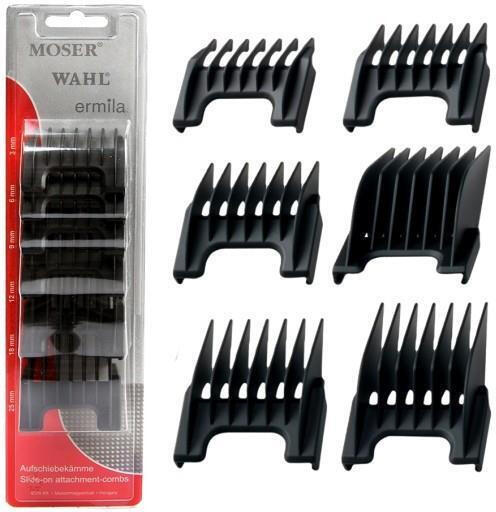 Vágófésű készlet 6 db-os Az alábbi Wahl / Moser géptípusokhoz alkalmazható: 1170, 1400, 1230, 1870, 1871, 1872, 1874, 1876, 1877, 1885, 1886, 1887, 1888, 4212 (A négyjegyű típus számot megtalálja hajvágógépének dobozán a vonalkód felett! XXXX-YYYY Az első négy számjegy elegendő) 6 db-os toldó fésű készlet tartalmaz egy 3 mm, 6 mm, 9 mm, 12 mm, 18 mm, 25 mm toldó fésű