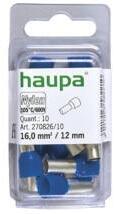Haupa 270826/10 Érvéghüvely 16/12mm kék, bliszteres Szigetelt Elekrolit réz, ónozva Méretek DIN 46228. 4. része alapján Színsorozat III, DIN sorozat Cikkszám: 270826/10 Vezeték keresztmetszet: 16 Szín: kék d1: 6.0 d2: 9.6 s: 0.2 th: 22.2 l: 12