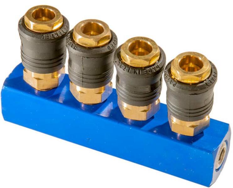 Négyutas pneumatikus elágaztató, 4 db Ø13 mm-es kimenőággal (gyorscsatlakozófejjel) és 1 db 3/8" belsőmenetes bemenő csatlakozóval. Gyors és egyszerű megoldást nyújt a szimpla légvezeték 4 különálló ágra történő elosztásához.