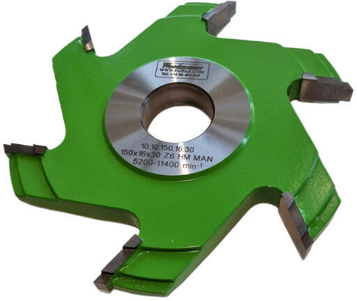 Természetes fához, MDF-hez és egyéb bútor alapanyagokhoz, műanyaghoz, vasalatok és zárak helyének marására, lépcsőzetes nútok kialakítására tervezett 150x16,3x30 mm Z6 HM HW vasalathelymaró, professzionális faipari asztali marószerszám asztalos marógépekhez, vídia (keményfém) élekkel. 150 mm átmérőjű, 16,3 mm vastag, 6 késes, HM, forrasztott lapkás vasalathelymaró