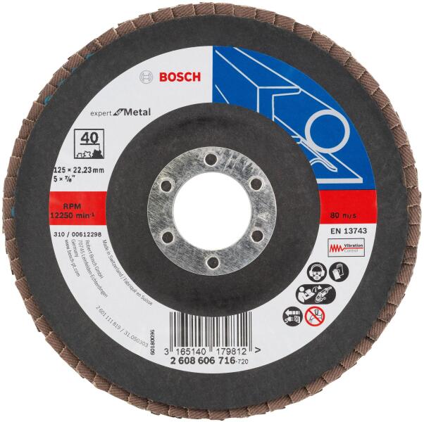 Bosch X551 Zirkon legyezőtárcsa ø 125 mm, ø 22.23 mm, P40 Korongátmérő: 125 mm Furatátmérő: 22,23 mm Szemcseméret: 40 mm X551 Expert for Metal csiszolótárcsák Az X551 Expert for Metal lenyűgöző anyageltávolítási aránnyal használható fémfelületeken Stabil, robusztus keresztszövésű hordozóanyaga biztosítja tartósságát és stabilitását kemény anyagok megmunkálás