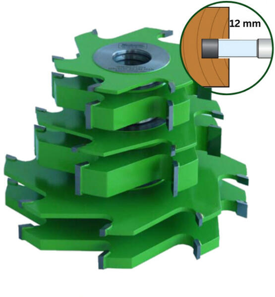 Természetes fához, MDF-hez és egyéb bútor alapanyagokhoz, műanyaghoz, 12 mm vastag és maximum 42,5 mm mély nútok, hornyok, vájatok, rések, csapok marására tervezett 125x12x30 mm Z6 HM HW nútmaró, professzionális faipari asztali marószerszám asztalos marógépekhez, vídia (keményfém) élekkel. 125 mm átmérőjű, 12 mm vastag, 6 késes, HM, forrasztott lapkás nútmaró, tárc