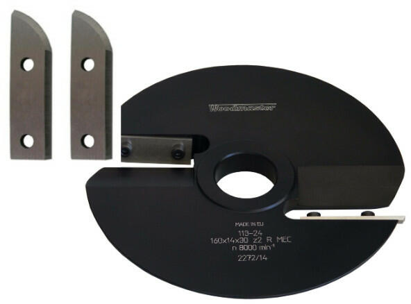 Természetes fához, keretes szerkezetekhez, betétek és panelek marására tervezett 160x14x55x30 mm Z2 (R jobbos, felülről dolgozó) HSS plattoló maró, professzionális faipari asztali marószerszám asztalos marógépekhez, gyorsacél élekkel, egyszerű profillal. 160 mm átmérőjű, 14 mm vastag, maximum 55 mm mélységű, 2 késes, R jobbos, HSS, váltólapkás plattoló maró, Woodmas