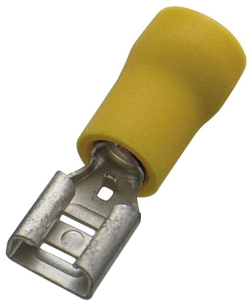 Haupa 260396 Csúszósaru hüvely 6 6,3/0,8 sárga sárgarézből, ónozva, PVC szigeteléssel rezgésmentes vörösréz hüvellyel könnyű kábelbevezetés