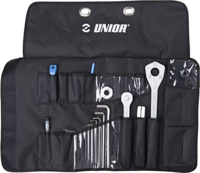 UNIOR WRAP PRO kerékpáros szerszámkészlet. A KÉSZLET A KÖVETKEZŐKET TARTALMAZZA: Hosszú imbuszkulcs golyós, 1.5, 2, 2.5, 3, 4, 5, 6, 8 mm-es méretben TX profilkulcs, T25 méret Kurbli fogantyú szerszám Láncszerszám Kerek küllőkulcs Két gumiabroncskar készlet Phillips csavarhúzó PH0 Pro Socket fogantyú Lánc kopásjelző Kazettakulcs és kazettazár szerszám 2 az 1-ben tárcsa