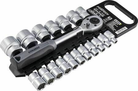 Angol nyelvű leírás (a magyar fordítást lásd lejjebb):includes the following tools:Reversible ratchet, with external square 6.3 mm (1/4")Reversible ratchet, with external square 12.5 mm (1/2")Socket set, drive 6.3 mm (1/4") drive, Super Lock: 4 - 4.5 - 5 - 5.5 - 6 - 7 - 8 - 9 - 10 - 11 - 12 - 13 - 14 mmSocket set, drive 12.5 mm (1/2") drive, Super Lock: 10 - 13 - 14 - 16 - 17 - 18 - 19 - 20