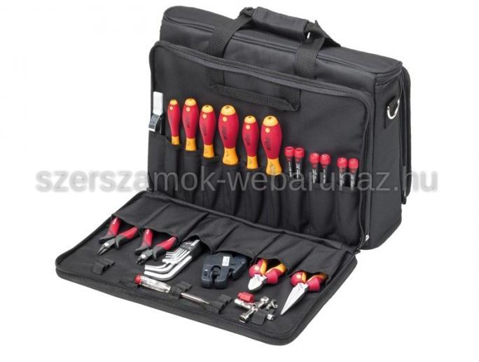 Professzionális, ipari minőségű WIHA Professional villanyszerelő szerszámtáska 29 részes VDE 1000V V1912 9300-030/37137. A 29 részes készlet tartalma 1-1 db: SoftFinish üthető lapos csavarhúzó SL3,5x75; SL5,5x100; SL6,5x125; SL10,0x175 SoftFinish üthető Philips csavarhúzó PH1x80; PH2x100, PH3x150 SoftFinish Pozidriv csavarhúzó PZ1x80; PZ2x100; SoftFinish TORX csavarhúzó T15x