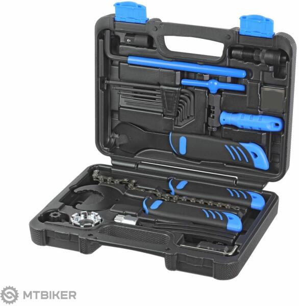 A HOME készlet egy átfogó, 22 részes szerszámkészlet, amely nem csak a kezdők, hanem a tapasztalt kerékpárosok igényeit is kielégíti. Tartalmazza az alapvető eszközöket, mint például egy 6 darab sarokkulcsot, csavarkulcsot, láncszegecselőt, központosító kulcsot, pedálkulcsot, kazettás lehúzót, forgattyús lehúzót, középső köteglehúzót, ragasztókészletet és sok