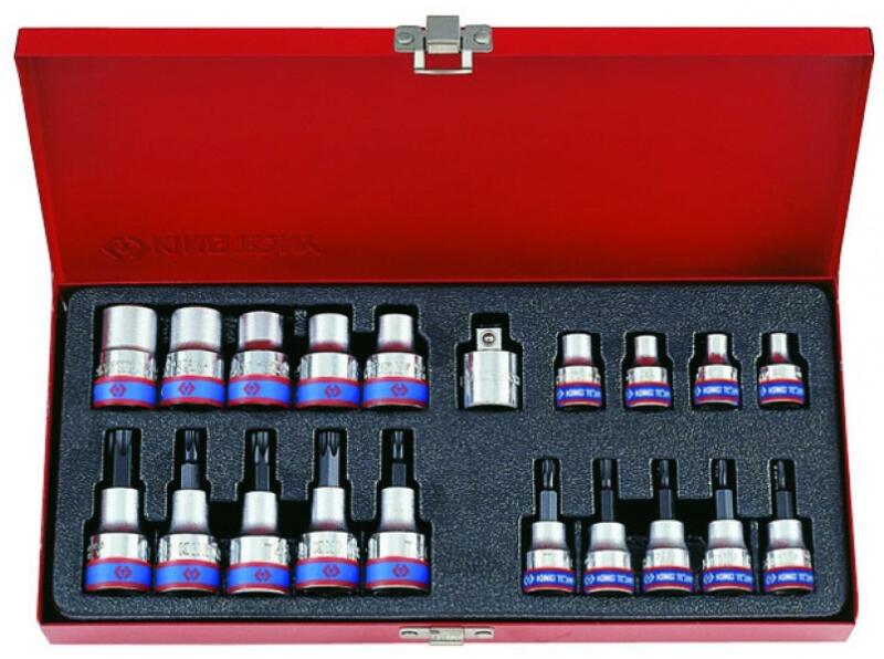 King Tony 20 részes külső-belső furatos Torx készlet 1/2" - 3/8" csatlakozásokkal fém kazettában. Tartalma: Belső E-Torx: 3/8"-os: E6 / E7 / E8 / E10 1/2"-os: E12 / E14 / E16 / E18 / E20 Furatos Torx: 3/8"-os: T10 / T15 / T20 / T25 / T27 1/2"-os: T30 / T40 / T45 / T50 / T55 + 1 db adapter (3/8"-1/2")