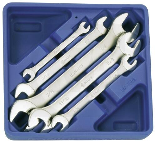 Genius Tools - Canada5 db-os colos méretezésű készlet kék műanyag tartórekeszben:Méretek: 1/4";x5/16";, 3/8";x7/16";, 1/2";x9/16";, 5/8";x11/16";, 3/4";x7/8";Két vége ükrösre polírozott, középen mattított exluzív, vékonyított kivitel. Fiókosztás: 1:6
