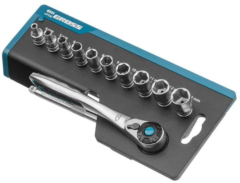anyag: CrV, kovácsolt acélbefogás: 1/4"tartalmaz: 4, 5, 6, 7, 8, 9, 10, 11, 12, 13mm fejek, 120mm hosszabbító, hajtószárméretek: 230x103x55mmEAN kód: 4044996161303