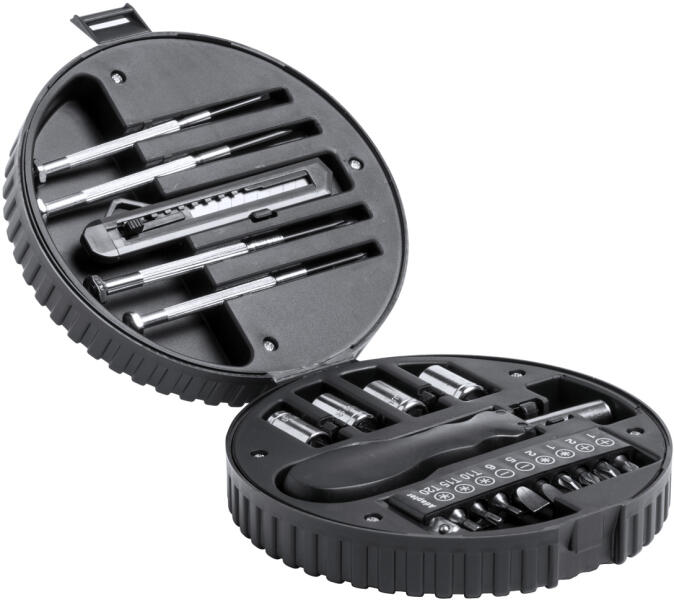 20 részes szerszámkészlet autókerék alakú műanyag tokban.