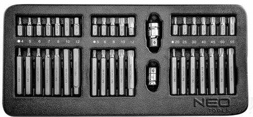 NEO csavarbehajtó bit készlet (Ref. sz. 84-236), 40 darabos, kimagasló minőségű króm-vanádium acélból kivitelezve. A készlet hatszögletű, Torx, Spline hegyek gazdag csomagját tartalmazza kétféle: 30 és 75 mm hosszban. A készlet két: 1/2" és 3/8" szűkítőt is tartalmaz. A szerszámok praktikus, a NEO 84-221 és 84-222 szerszámos szekrények fiókjaiba illő műanyag bőröndb