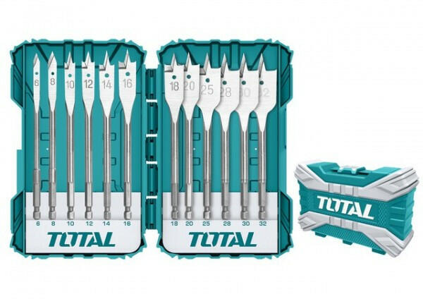 12 db lapos fafúrószerszám készlet / INDUSTRIAL (TACSDL1201) A TOTAL TACSDL1201 lapos fúrókészlet 12 darabból áll. A puha és kemény fafajták és gipszlapok lyukasztására szolgál. Minden fúró 152 mm hosszú. Átmérőjük 6 mm-től 32 mm-ig terjed, ami különböző méretű lyukak kialakítását teszi lehetővé. Az eszköz minőségi szerszámacélból készült, ami biztosítja