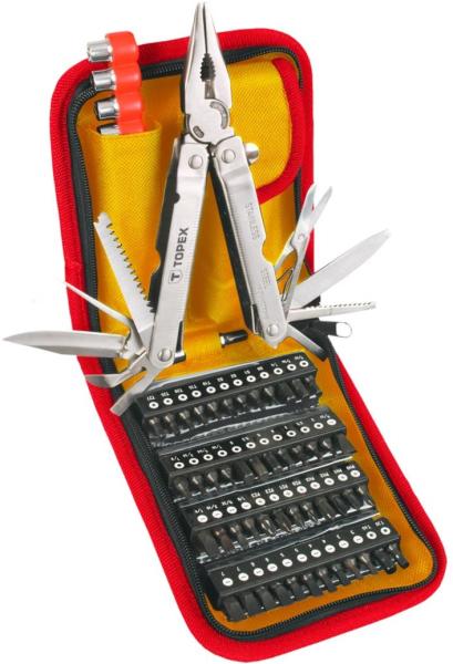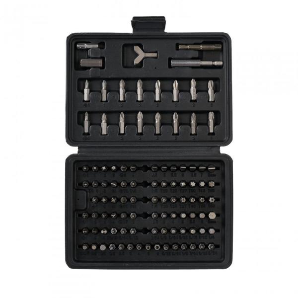 9 db imbuszkulcs: 1.5-10 mm 10 db bitfej 25 mm 8 db 1/4" dugókulcs 5-12 mm 1 db 1/4" racsnis hajtószár 1 db kombinált fogó 150 mm 2 db csavarhúzó (PH0, SL3) 2 db csavarhúzó (PH2x100, SL6x100 mm) 1 db bittaró 1 db kalapács 300 g 1 db mérőszalag 1 m 1 db fázisceruza 1 db vágókés törhető pengével 18 mm