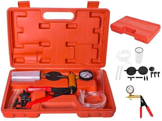 "Autós fékrendszer, fékfolyadék légtelenítő, vákuumszivattyú készlet, fékfolyadék tartállyal Univerzális autós diagnosztikai szerszámkészlet a fékrendszer teljes körű karbantartásához. A készlet alkalmas benzin és dízel autók ellenőrzésére is. Elengedhetetlen eszköz egyszerűbb szervízek esetén, illetve hozzájárul a sofőr és az utasok biztonságához is. A kész