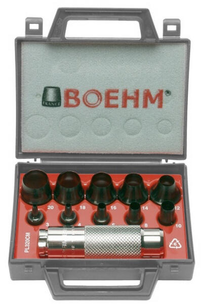 Precíziós köszörülésű lyukasztókések Késtartó akár 2 különböző méretű lyukasztókésnek Alkalmas gumihoz, bőrhöz, filchez, műanyaghoz, parafához, szövetekhez vagy hasonló anyagokhoz Praktikus szerszámkofferben Figyelem! Stancoláshoz alátétként használjon fát, bőrt vagy hasonló anyagot! Lyukasztókések 3; 4; 6; 8; 10; 12; 14; 16; 18; 20mm Szerszámbefogó