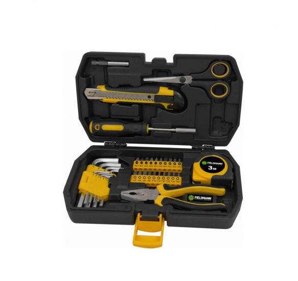A Fieldmann FDG 5011-35R szerszámkészlet 35 részből áll. A szerszám szett egy tömör műanyag hordtáskában található. A doboz tartalma egy 6" kombináltfogó, dugókulcs hajtószár, imbuszkulcs készlet 9 különböző méretben, 20 darabos bitfej készlet mágneses tartóban, olló és kés. Kiváló választás minden műhelybe, barkácssarokba vagy akár háztartásba. Tartozék 1x