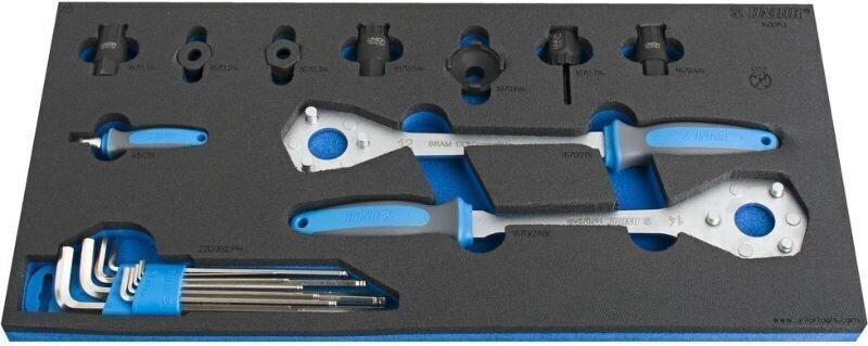 Ez egy automatizált szoftver általi fordítás:Kerékpár szerszámkészlet az SOS szerszámtálcában. A készlet olyan általánosan elérhető kerékpárjavító eszközökből áll, mint például csavarhúzók és fogók. Az eszközt egy kiváló minőségű, SOS habból készült tárban tárolják, amely illeszkedik a 938 vagy 939 szerszámos dobozok egyikébe. N fejlett technológia Az