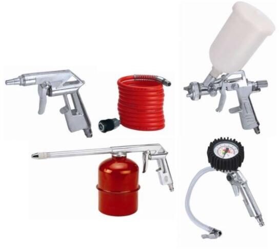 Komplett készlet műhelyek számára, széleskörű alkalmazási lehetőségekkel, pl. lakkozáshoz, kerékfúvatáshoz, felülettisztításhoz (lefúvatáshoz) A készlet tartalma: szórópisztoly felső tartállyal gázolajszóró pisztoly lefúvató pisztoly manométeres kerékfúvató pisztoly 5 m-es pneumatika spirál tömlő