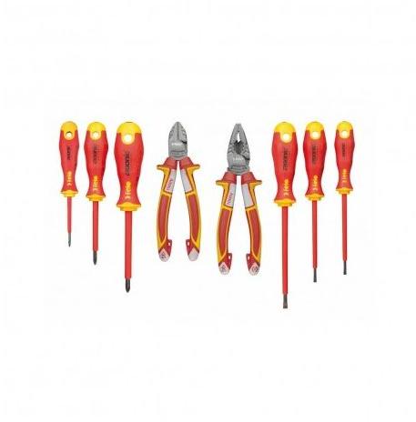 Felo - Made in Germany Csavarhúzó készlet szigetelt ERGONIC markolattal. Az egyetlen markolat, melynek a belsejében lévő zselés cella alkalmazkodik a felhasználó tenyeréhez, a maximális nyomaték kifejtése mellett, egyedülállóan kényelmessé teszi a munkavégzést. A csavarhúzók és a fogók 1000 voltig használható. Minden darab 10.000 volttal tesztelt, megfelel az EN60900 szab