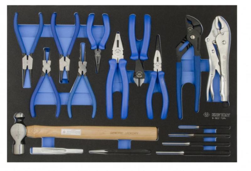 KING TONY fogó, csapkiütő és kalapács készlet 17 részes 9-90217GRV. Tartalma: 764: 3;4;5;6; 76105-06; 76717-05; 7811-16; 6011;10R; 6111-08; 6231-07; 6311-08; 6314-05; 68HB-07; 68HS-07; 68SB-07; 68SS-07; 6511-10C Tálcaméret: #6 (560x375mm)
