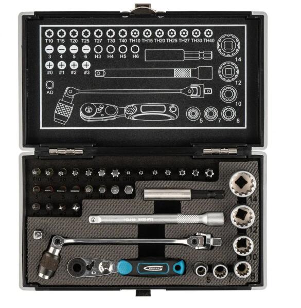 Szerszámkészlet 1/4 hüvelykes, műanyag tokban, 56 darab CrV acélból készült elemből áll, és menetes kötőelemek meghúzására és lecsavarására szolgál. A mellékelt 2 hosszabbító és egy kardán megkönnyíti a nehezen hozzáférhető helyeken történő munkát. A készlet használható autójavításhoz a garázsban, és egyéb házkörüli munkáknál. Kopásállóság - a k
